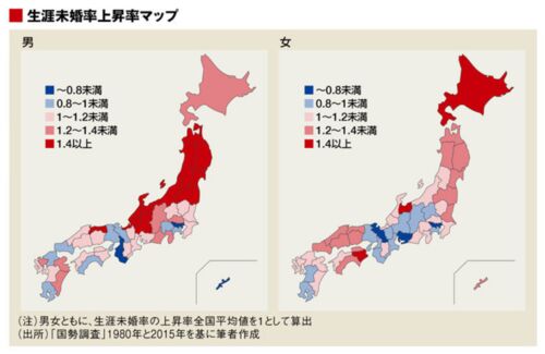 4月上旬に、新聞紙上を「生涯未婚率」という言葉が席巻しました。これは、国立社会保障・人口問題研究所が2015年の国勢調査をもとに、全国の都道府県別の生涯未婚率などを正式発表したからです。 生涯未婚率の確定値はすでに去年の10月には確定していました…